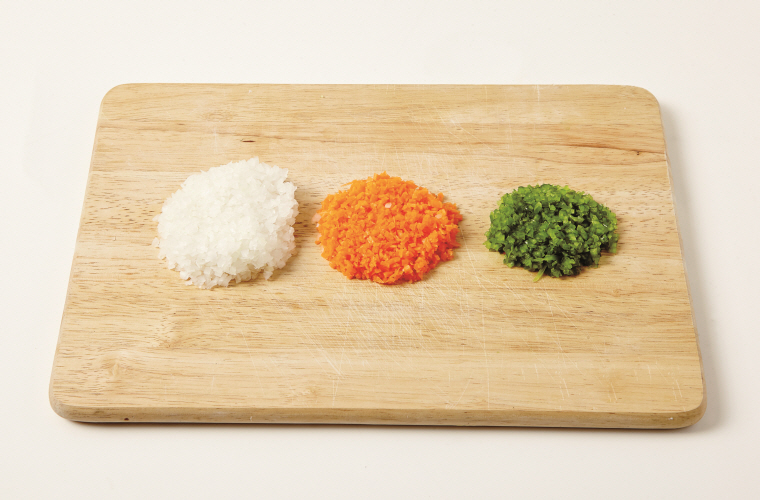 2. 양파, 당근, 피망은 잘게 다진다.