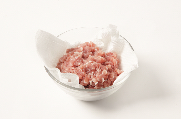 3. 다진 돼지고기는 키친타월에 밭쳐 핏물을 뺀다.