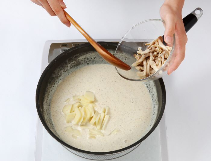 5. 냄비에 ①과 ③의 콩물을 붓고 중불에 올려 바닥에 고형물이 눌러붙지 않도록 나무 주걱으로 살살 저어 주면서 끓기 시작하면 ②의 감자와 ④ 의 버섯을 넣고 감자가 으깨지지 않도록 살살 저어 주면서 서로 어우러지게 끓으면 불을 끈다.