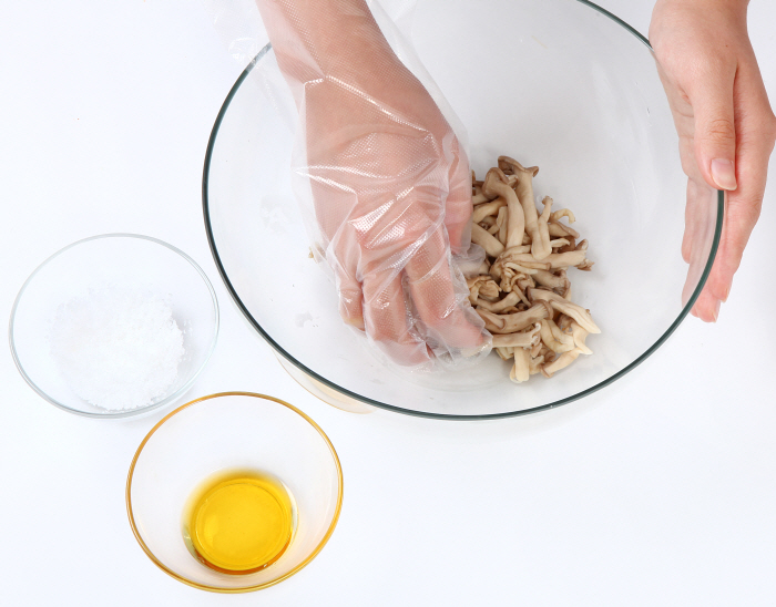 4. 버섯은 손질하여 데쳐서 찬물에 씻고, 물기를 짠 다음 소금과 들기름으 로 조물조물 밑간을 한다.