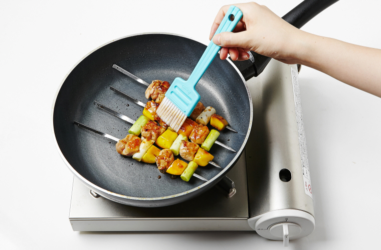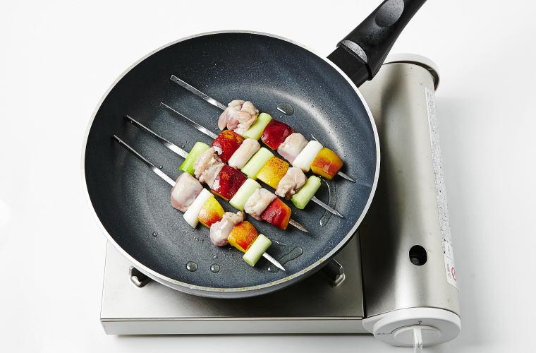 6. 중간 불로 달군 팬에 식용유(2T)를 두르고 꼬치를 올려 앞뒤로 익힌다.