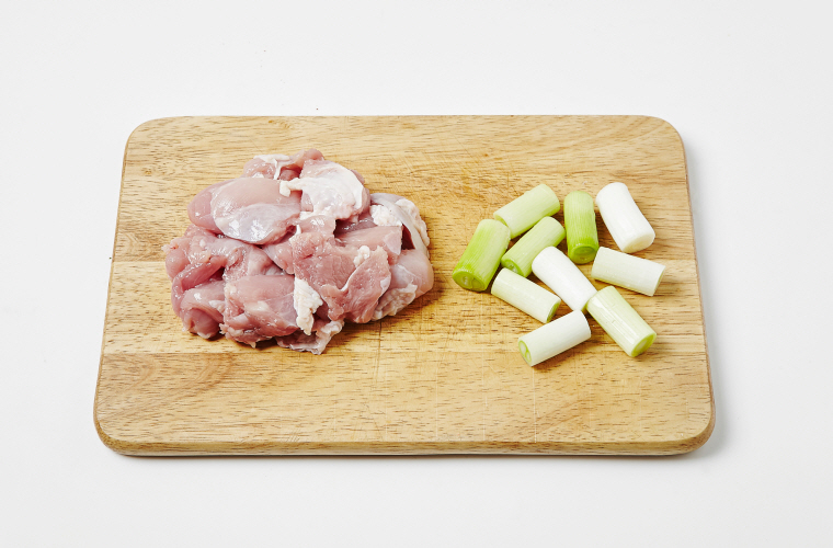 3. 닭다릿살은 기름기를 제거한 뒤 복숭아와 비슷한 크기로 썰고, 대파는 3cm 길이로 썬다.