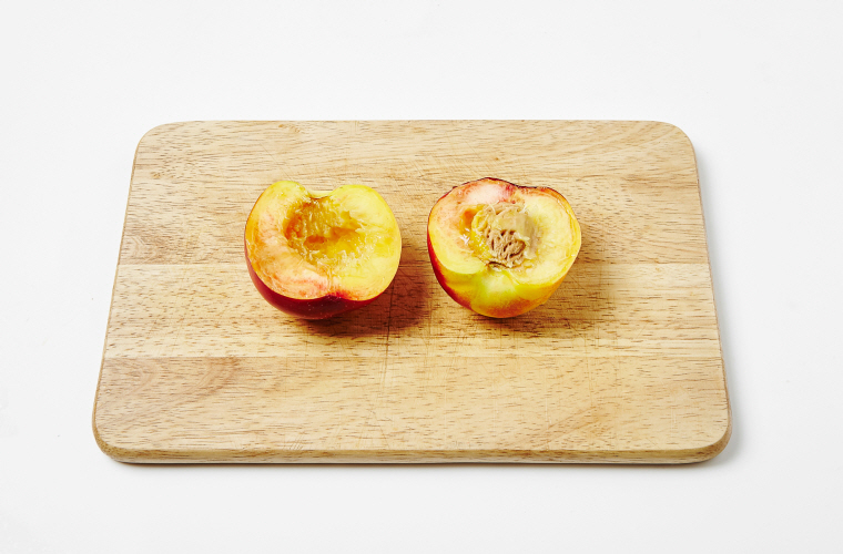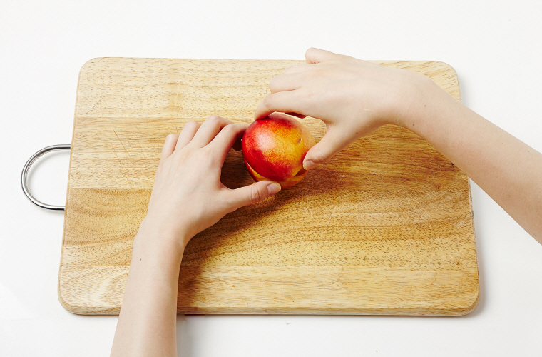 1. 복숭아는 씨를 중심으로 칼집을 넣고 한 바퀴 돌린 뒤 반으로 가른다.