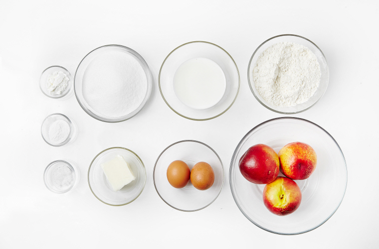 ▶주재료 : 천도복숭아(3개), 버터(75g), 달걀(60g), 우유(1/2컵), 밀가루(150g)