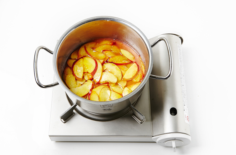 2. 냄비에 복숭아, 설탕(3T), 녹말가루를 넣고 중약 불에서 조린다.