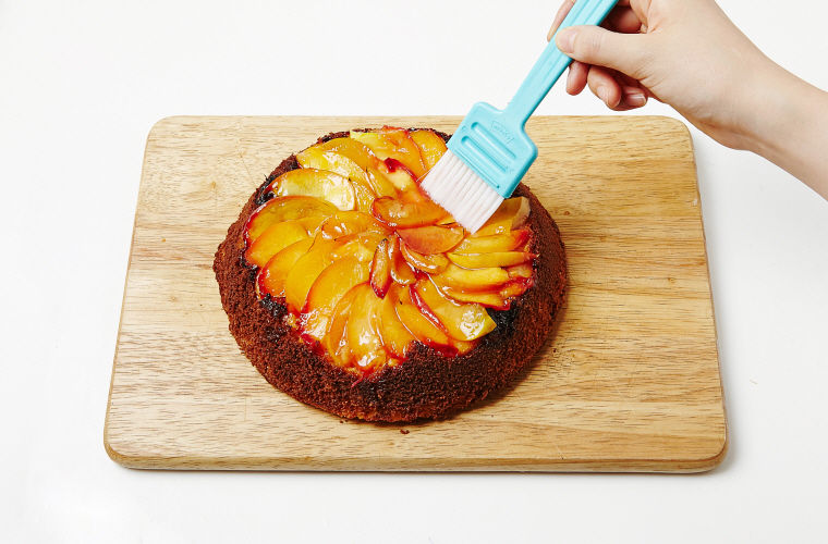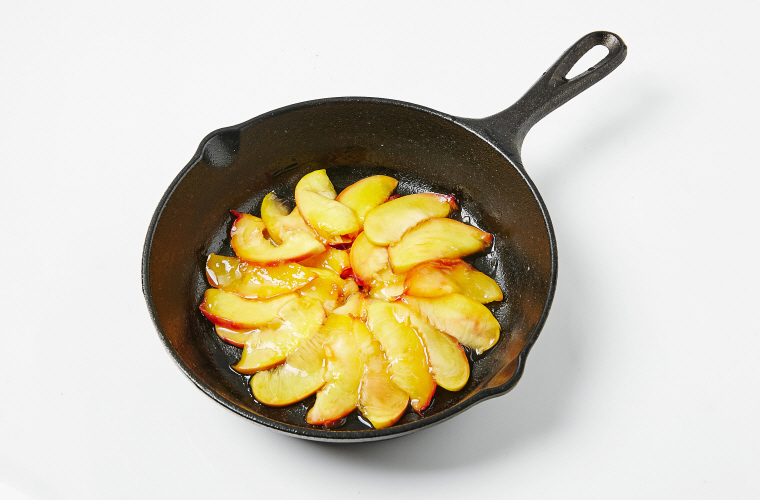 7. 두꺼운 팬에 복숭아조림을 깔고 반죽을 부은 뒤 뚜껑을 덮어 중약 불에서 15~20분 정도 굽는다.
