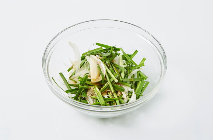 5. 양파와 부추에 간장, 매실액, 참기름, 참깨를 넣고 버무려 곁들인다.