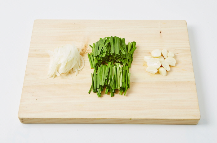 1. 양파는 곱게 채 썰고, 부추는 5cm 길이로 썰고, 마늘은 2등분한다.