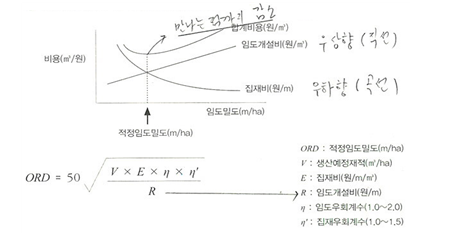 임목축적이 증가할수록 적정임도밀도는 높아진다. 임도밀도가 높아지면 평균집재거리는 짧아진다.