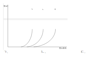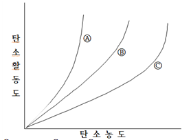 1. 탄소농도에 따른 탄소 활동도의 개략도, 세 종류의 용강(Fe-C, Fe-Si-C, Fe-Cr-C)과 Ⓐ Ⓑ Ⓒ에 맞추기