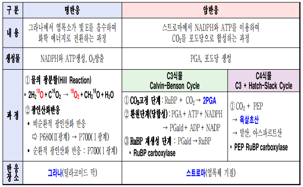 * 광합성 과정 : 6CO2 + 12H2O + 광E → C6H12O6 + 6O2 + 6H2O +18 ATP