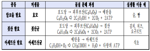 - 발효의 종류 : 중간 산물의 종류에 따라 알코올, 젖산, 아세트산 발효