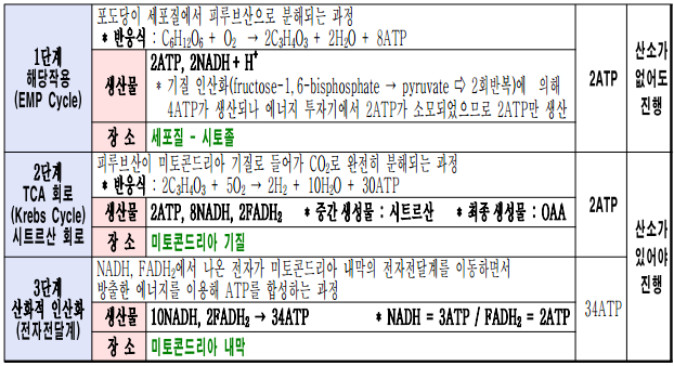 ☞ 호흡작용의 4단계 : 해당작용(EMP) → Acetyl CoA 형성 → TCA회로 → 전자전달경로