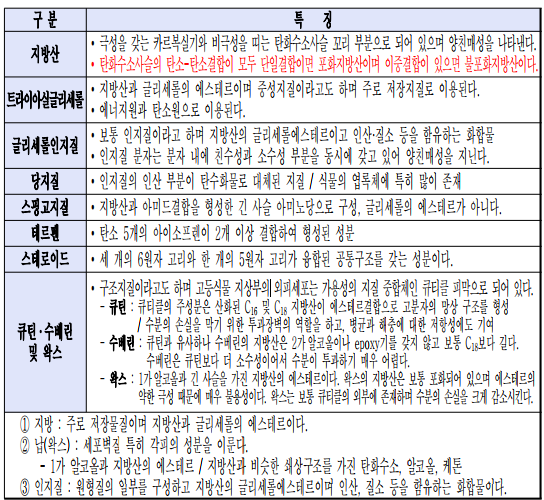 * 지방산은 우수의 C가 길게 이어진 유기산이며, 고등식물에서 발견되는 것은 C가 12~26이다.
