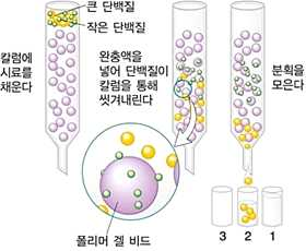 - 크기별 분리 크로마토그래피(=겔 여과 크로마토그래피):분자량이 다른 단백질을 가려낼 때 유용함