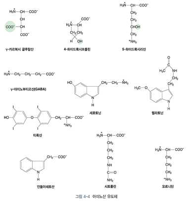 글리신, γ-아미 노부티르산(GABA), 세로토닌(트립토판 유도체), 멜라토닌(트립토판 유도체)