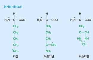 ⋅리신 : 아미노기는 물로부터 양성자 받아 암모늄 이온으로 됨.