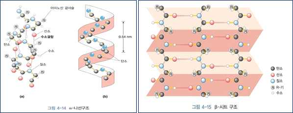 - 2차 :폴리펩티드 사슬 골격 이루는 원자들 공간 내 배열 구조