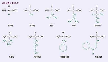 ⋅비극성 아미노산인 글리신, 루신, 페닐알라닌 및 프롤린 등이 많음
