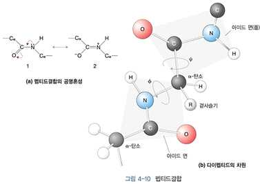 | ※ 펩티드결합의 특성 : 단일결합보다 짧고 강하며, 부분적으로 이중결합의 특성을 가지고 대부분 트랜스(trans-) 결합임(펩티드 결합의 공명혼성) ※ 공명혼성(resonance hybrid) : 전자의 위치만 다른 2개 또는 그 이상의 구조를 가진 분자 |