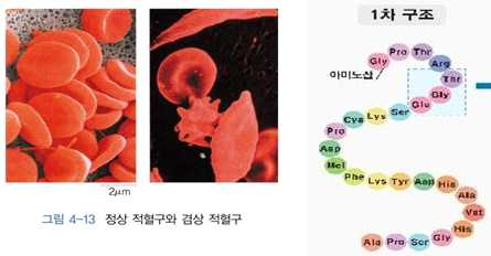 (예) 겸상적혈구빈혈증 : 정상 헤모글로빈 A의 β-사슬의 6번째 글루탐산이 발린으로 바뀌어 적
