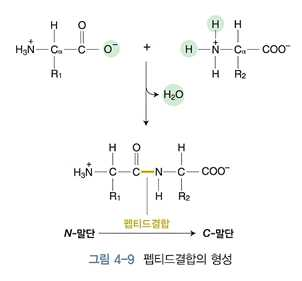 ⋅한 아미노산의 α-아미노기 + 다른 아미노산의 α-카르복실기의 아미드결합(amide linkage) →