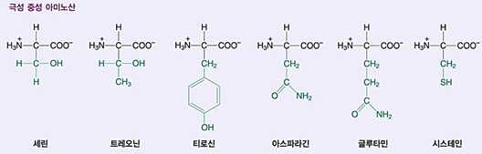 - 극성(중성, 산성 및 염기성) 아미노산으로 분류