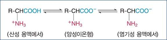 ⋅아미노산은 아미노기(+)와 카르복실기(-)를 함께 가지고 있기 때문에 전체 전하는 0