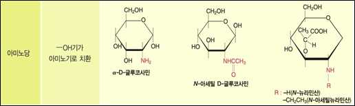 - 글루코사민에 아세틸기가 치환 : N-아세틸-α-D-글루코사민