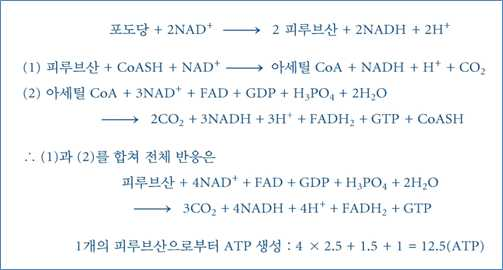 ⋅1개의 아세틸 CoA는 10개의 ATP, 1개의 피루브산은 12.5 ATP 를 생성함