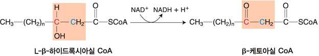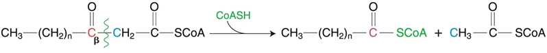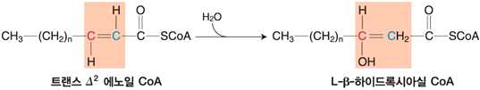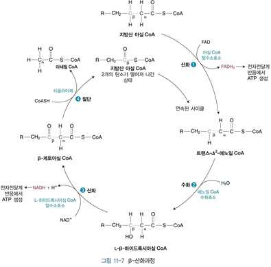 ⋅기질내에서 β–산화과정(카르복실기로부터 탄소 두 개 단위로 떨어짐) → 아세틸 CoA를 생성