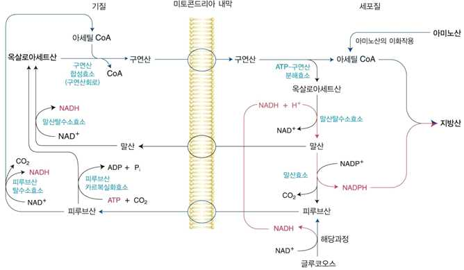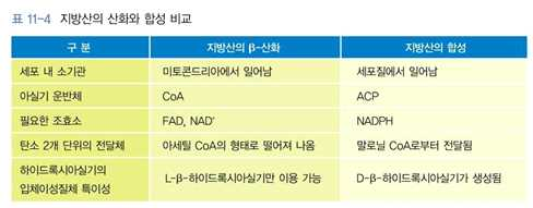 ② 미토콘드리아에서는 아세틸기가 직접 더해져 지방산의 베타산화의 반대과정과 유사하다.