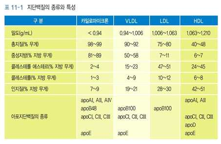 ⋅단백질과 지질의 조성에 따라 지단백질의 밀도가 달라짐