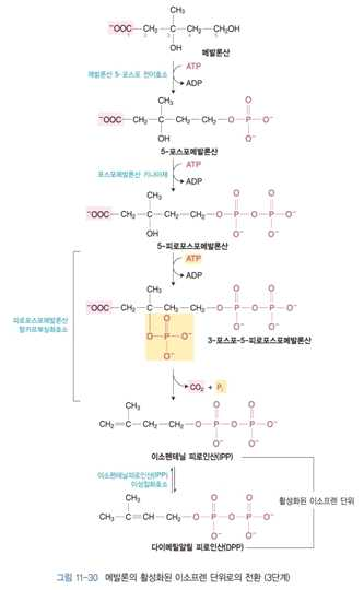 ⋅세 개의 ATP를 투입하여 탈탄산반응과 인산기 전이에 의해 메발론산을 두 종류의 활