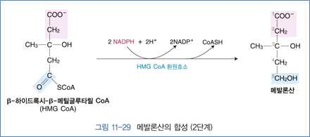 ⋅HMG CoA 환원효소에 의해 두 분자의 NADPH가 이용되면서 HMG CoA가 메발론