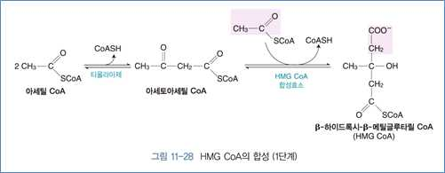 합성효소의 작용 에 의해 순차적으로 축합 → HMG CoA 합성