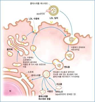 과 융합 → 콜레스테롤, 지방산, 아미노산 및 인지질 등으로 가수분해 → LDL 수용체