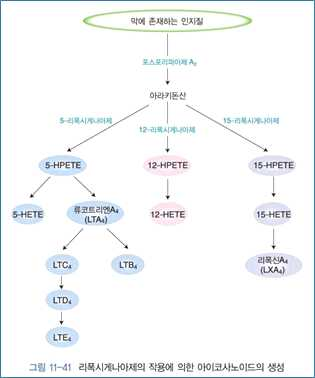 ⋅아라키돈산이 리폭시게나아제의 작용을 받게 되면 → 류코트리엔, 하이드로페록시아이코사테트