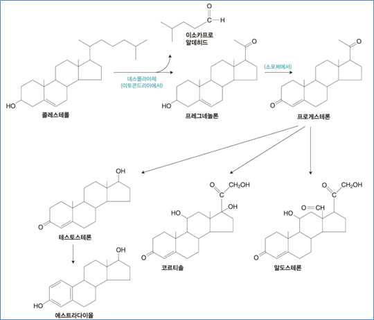 ⋅스테로이드 호르몬들은 모두 콜레스테롤에서 전환된 프레그네놀론, 프로게스테론이라
