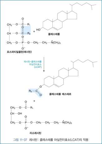 ⋅LCAT → 레시틴(포르파티딜콜린)의 2번 위치에 부착된 지방산을 콜레스테롤로 전이시켜 콜레