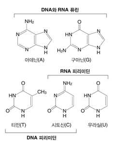 ⋅DNA : 퓨린 염기(아데닌(adenine, A), 구아닌(guanine, G)),