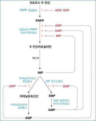 ⋅속도조절단계는 ATP 포스포리보실전이효소에 의한 PRPP와 ATP의 축합반응