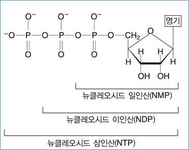 ⋅뉴클레오티드(nucleotie) = 뉴클레오시드 + 하나 이상의 인산기 첨가