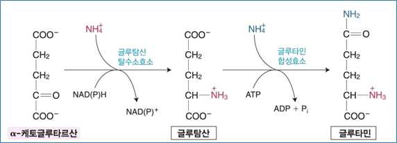⋅이 반응은 ATP의 가수분해를 필요로하며, 글루타민을 합성하는 것 외에 뇌와 간에서 암모니아