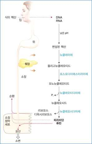 ⋅식이로 섭취한 핵산 분해 → 소장에서 일어남