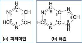 ⋅퓨린 염기는 피리미딘 고리화합물을 닮은 육각형과 이미다졸 구조의 오각형 고리화합물이 서로