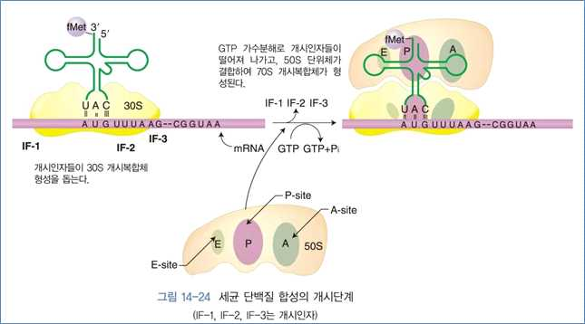 ⋅mRNA와 개시인자(IF), 30S 리보좀 단위체들이 GT, N-formylmethionin-tRNAfMet 등과 함