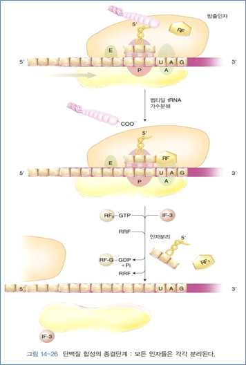 ⋅대신 그 자리에 방출인자(RF 1)가 자리하여 펩티드전이효소를 활성화시켜서 tRNA와 단백질