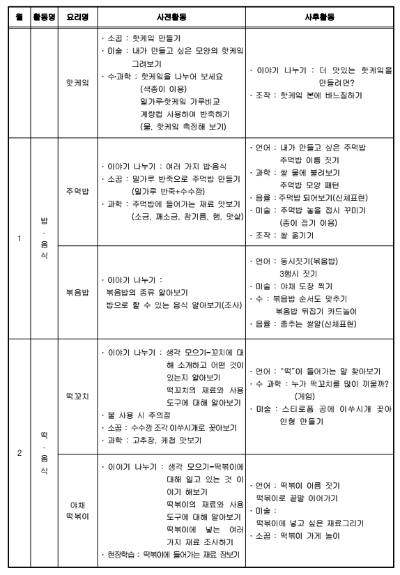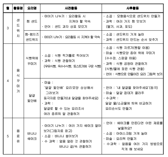기 등 쉬운 활동이 주가 되도록 하며 학기가 지나면서 좀 더 복잡한 요리활동으로 확장해 나간다 , .