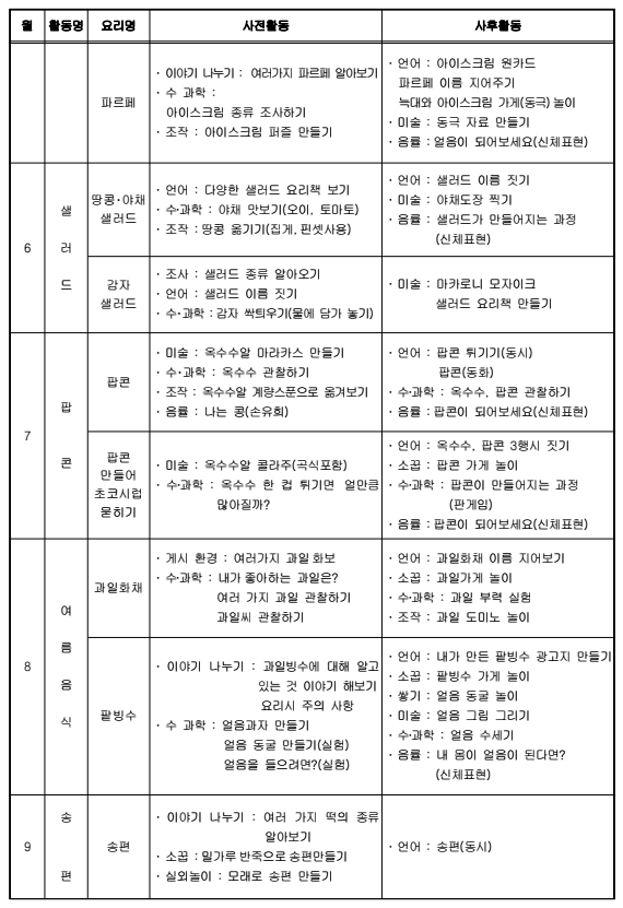 ② 유아들의 요리에 대한 관심과 접근이 쉽도록 교육 프로그램에 따른 교육 활동 주제 계절 명절 등을 고 , ,